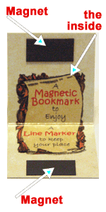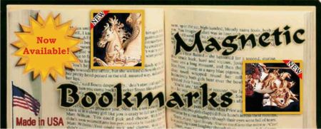 1) Because they have two magnets, they clip FIRMLY to the page. 2) You can MARK A LINE by placing them on the side of a page. 3) You will NOT LOSE your bookmark or your marked page. 4) Makes for a PERFECT INEXPENSIVE GIFT. 5) Most VIBRANT COLORS and framed in a gold foil frame. 6) Can be included in letters or cards, very LIGHT WEIGHT. 7) UNIQUE IN DESIGN and can be used with ONE HAND. 8) LAMINATED for durability and printed on QUALITY STOCK. 9) PROUDLY DESIGNED and MANUFACTURED IN THE USA. |
