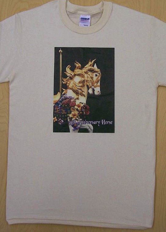 50th Anniversary Carousel Horse T-Shirt - Exclusive Joe Leonard T-Shirt Series featuring the 50th Anniversary Carousel Horse proudly displayed on the front. Each T-Shirt is 100% Cotton. Available in white only. Please state size (S, M, L, XL) when ordering. |