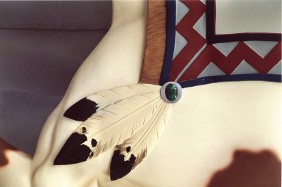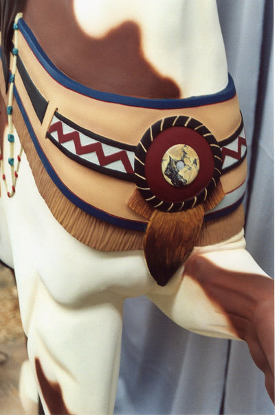 This Indian Pony Carousel Horse is 64 inches long, is carved in Basswoodand, and features Turquois embedded in its trappings.